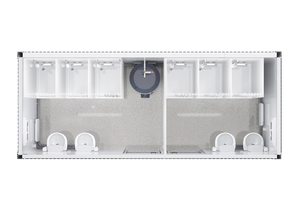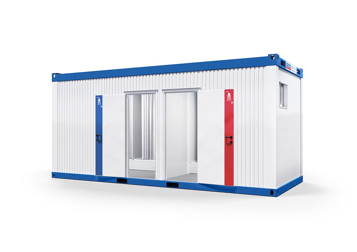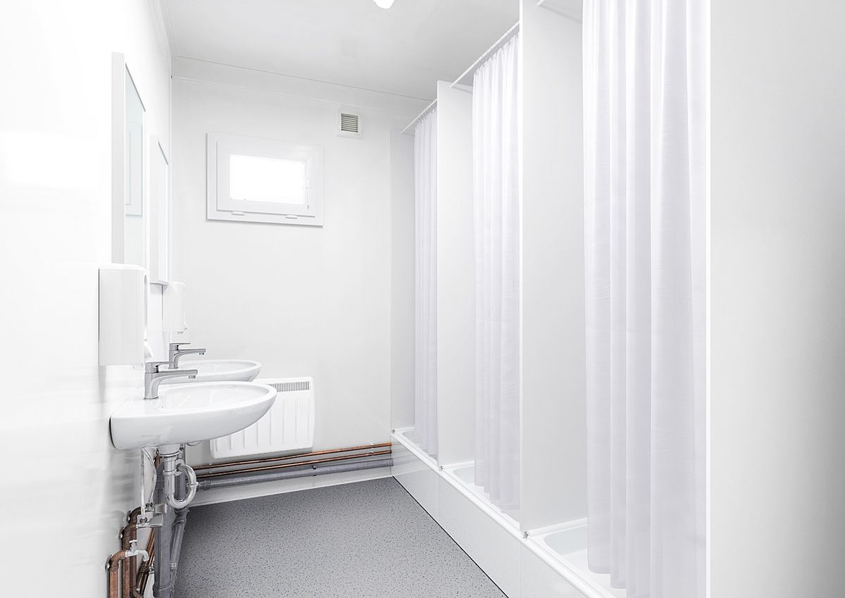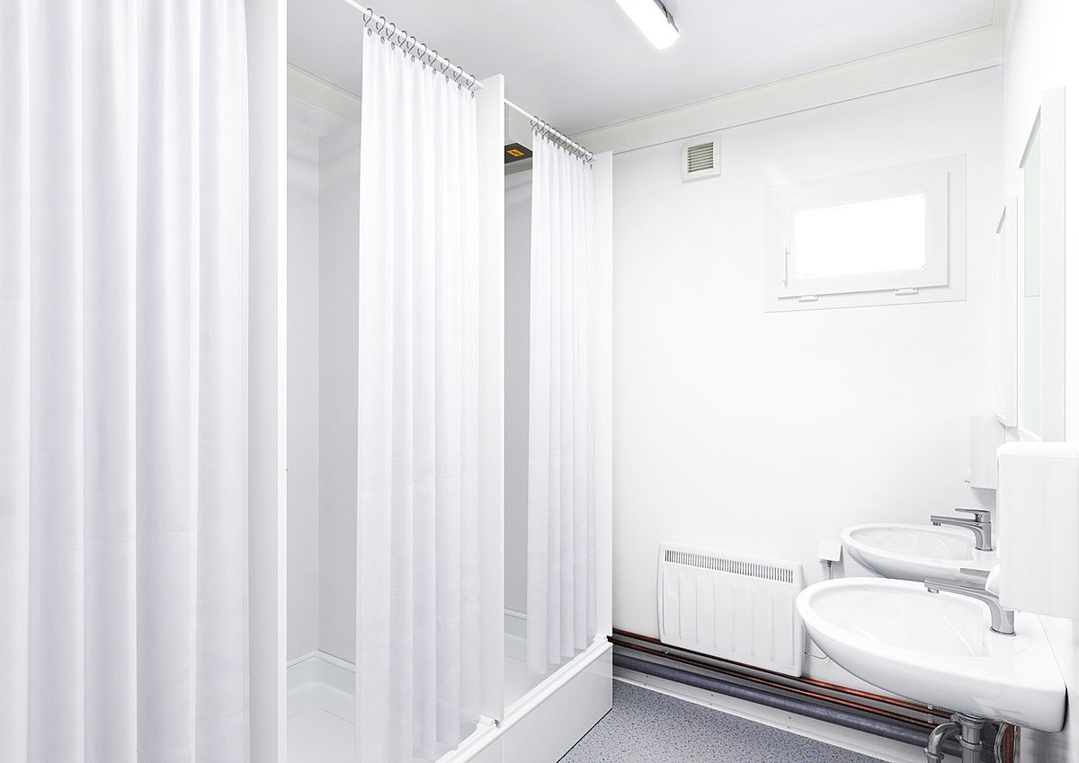 The functional interiors of these modules The functional interiors of these 20-foot modules have been closely tailored to the needs of the workers. After their shift, male and female employees can change and shower here in peace. Each shower is surrounded by a shower curtain. As a finishing touch, the women's and men's areas include two sinks and a heater.