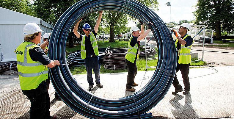 Todas nuestras tuberías de agua potable pueden ser reconocidas por el código de color azul para que los sistemas separados de agua potable y de aguas residuales estén protegidos. Las tuberías de PE con aislamiento especial permiten operar sin problemas infraestructuras de agua temporales incluso en áreas extremadamente calientes o frías. De esta manera, se garantiza el agua potable segura en cualquier lugar y en cualquier momento.